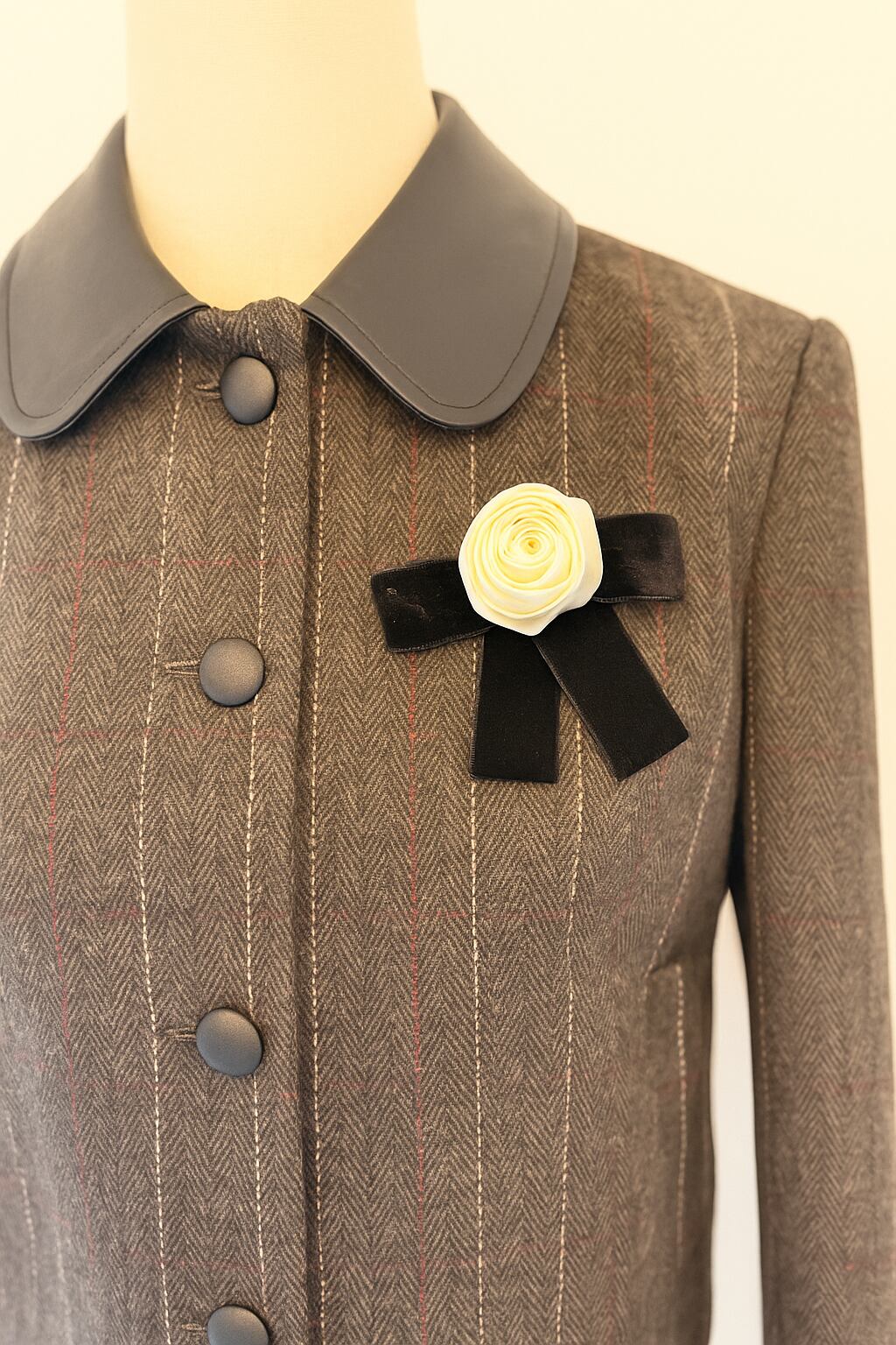 胸元にはベルベットリボン×フラワーブローチを添えて、女性らしい華やかさをプラス。