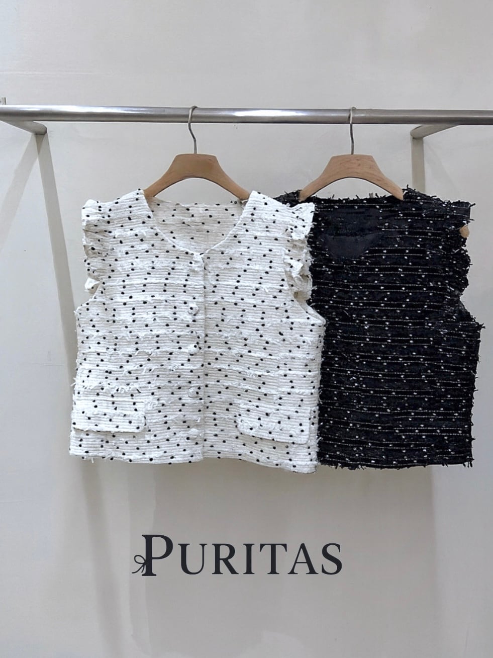 立体感のあるツイード素材に、さりげないフリンジと小ぶりなボタンが上品な印象のホワイトベスト。