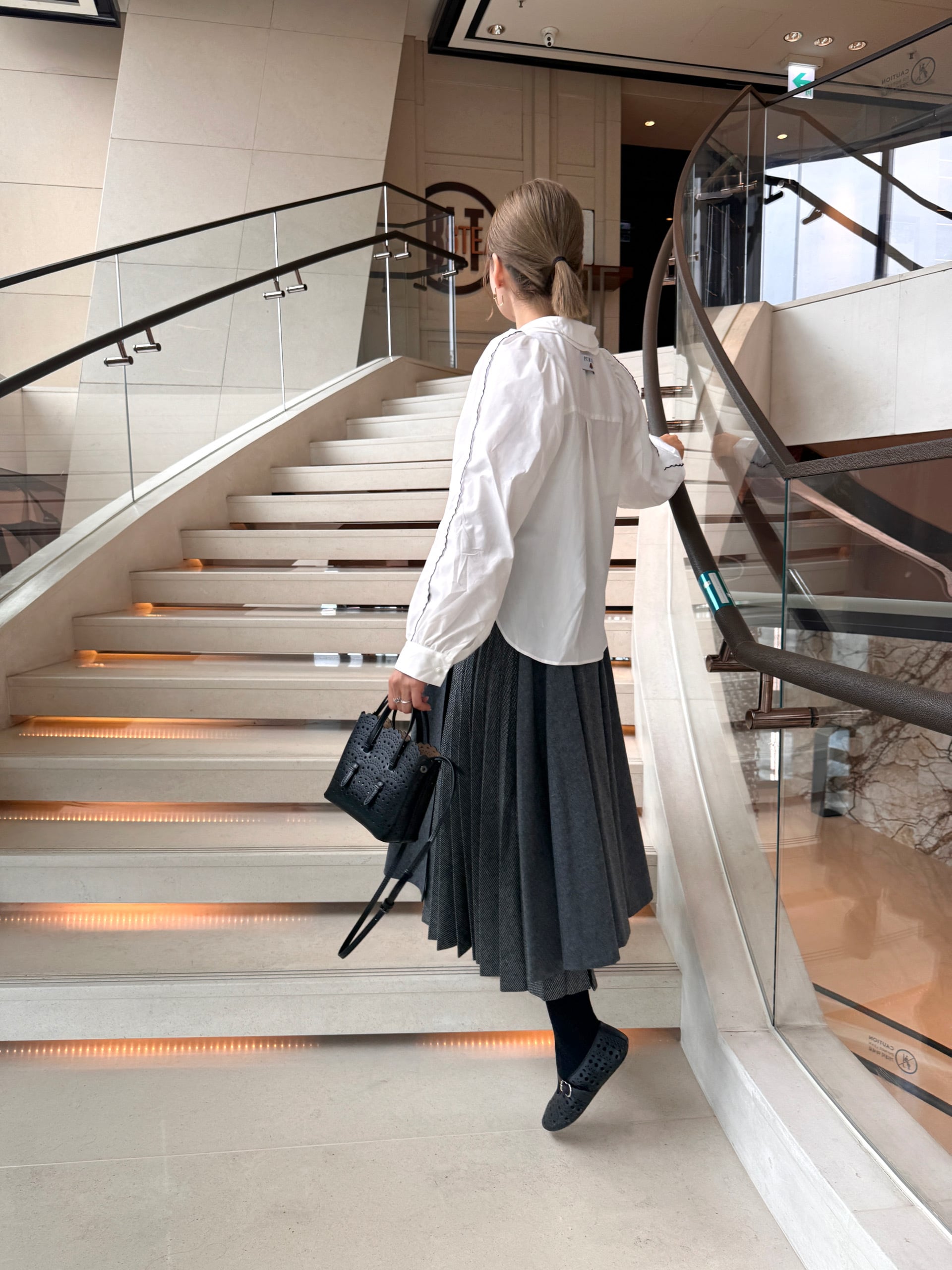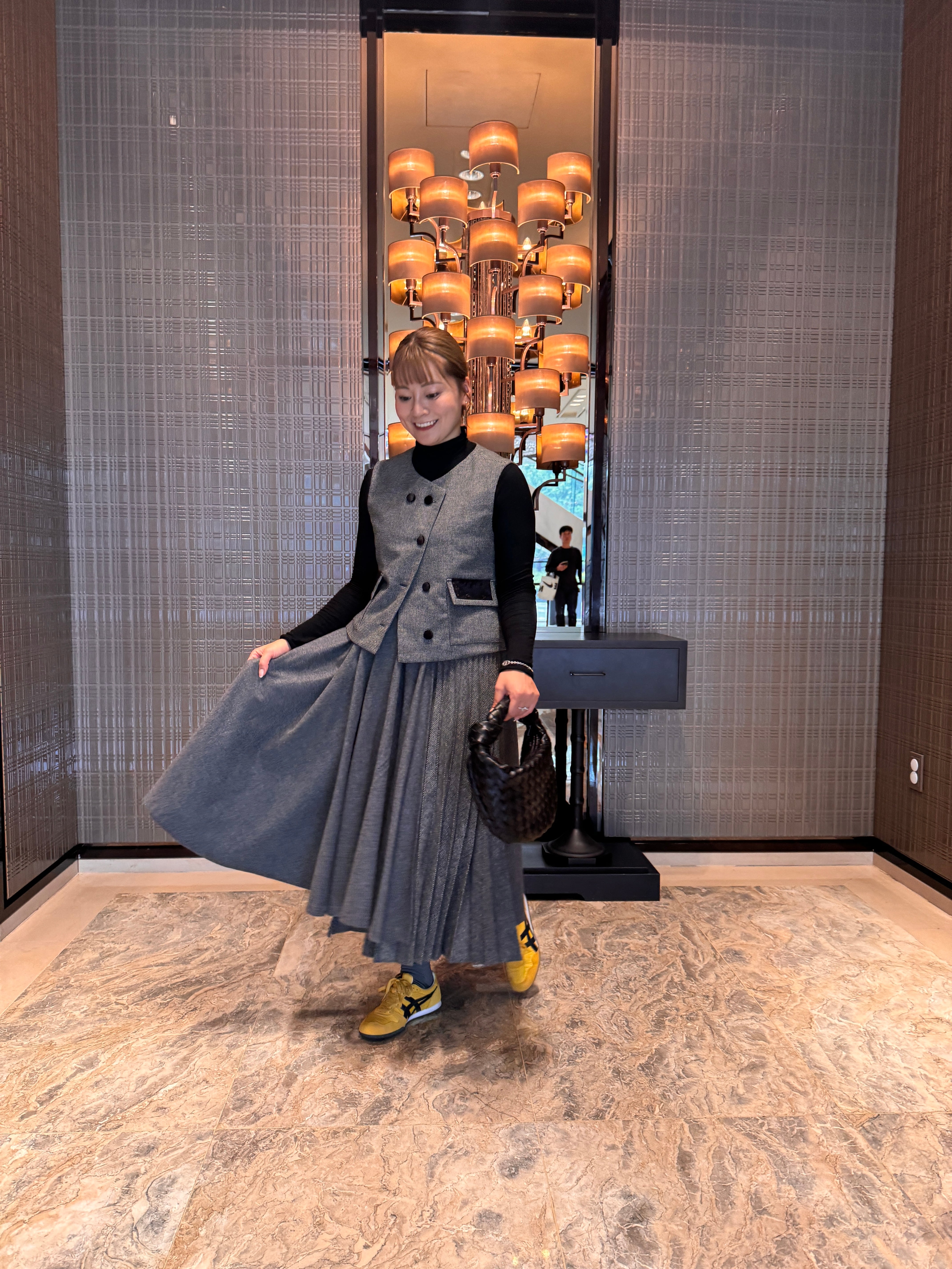 2種類のプリーツ加工が施されたスカートは、動くたびに綺麗に華やかに魅せてくれます。