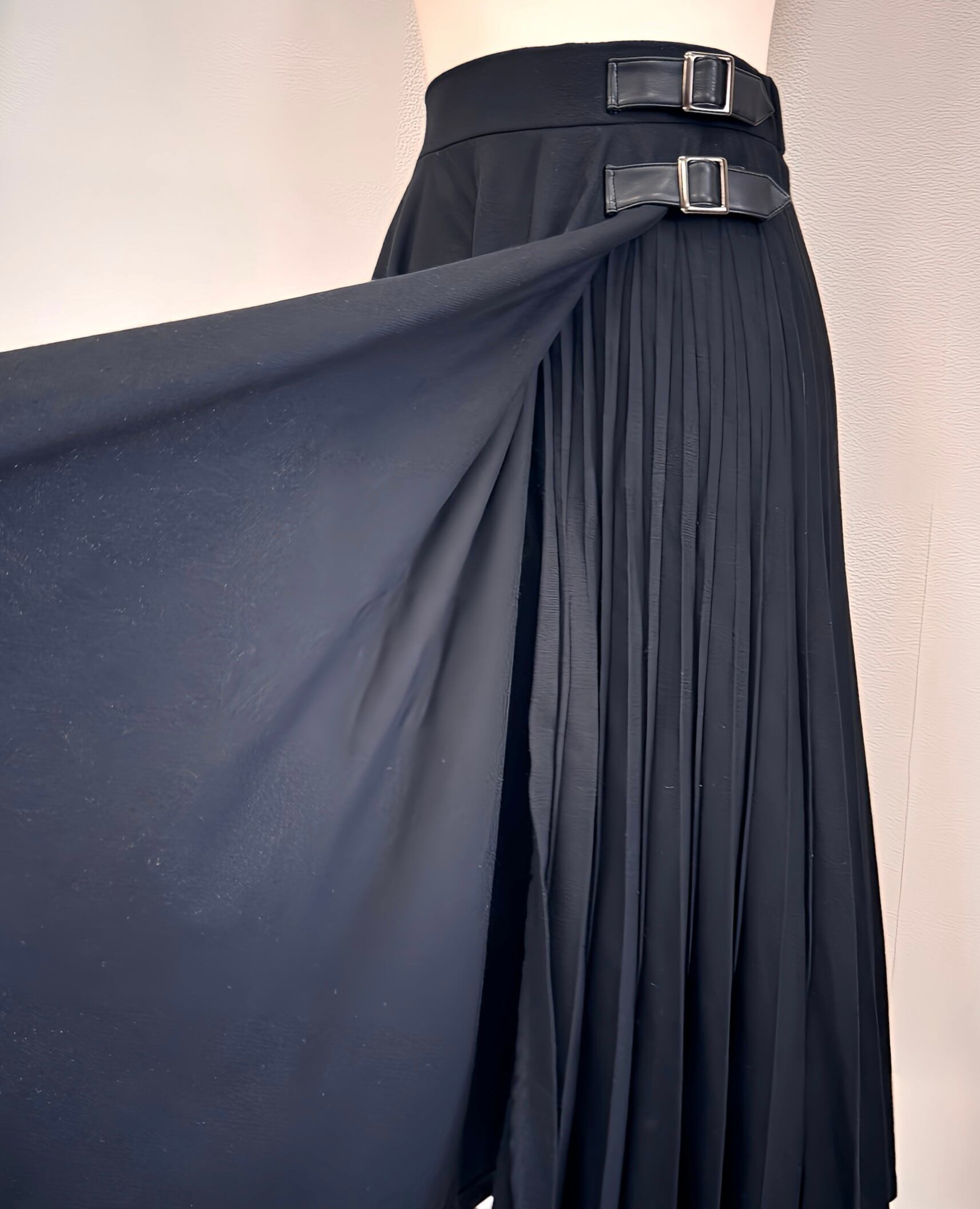 アシメトリーになっており、細かいプリーツの部分が少し長めの丈になっております。